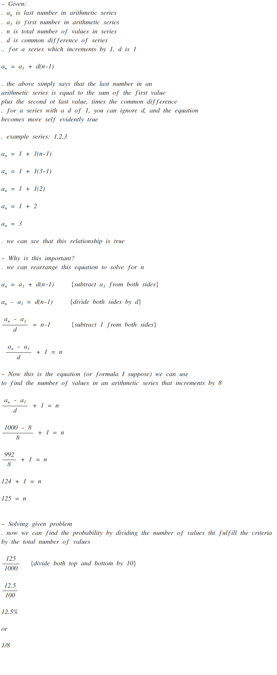 As such, we can conclude that the probability is 1/8 that a selected number is divisible by 8