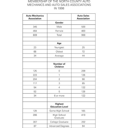 Question 14. Using the second column of the chart, there are 128 total men and women with 5 children, and you are given 92 women with 5 children. By subtracting, this leaves 36 men with 5 children. To find the total number of men who did not have 5 children, take the total number of all men (500) and subtract the number with 5 children (36). The answer is 464 men who did not have 5 children.