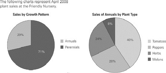 Question 7:The fastest way to answer this question is to assign numerical values to the percentages given in the graphs. You can choose any numbers to work with and get the same answer, but since the graphs give percentages, choosing 100 total plants sold will make things easy. If total plants sold were 100, 71 were annuals. Of those 71 annuals, the second graph says that 24% were herbs. 24% × 71 = 17.04. Since you started with 100 total plants, 17.04/100 = 17.04%. Choice D is nearest 17.04%, so it is the best answer.