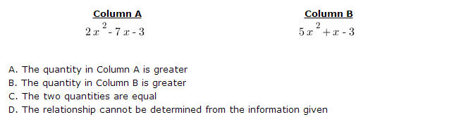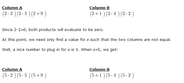 There’s a big advantage in looking for ways to make the two columns equal, rather than just plugging in numbers. Let’s say you plug in a number, and it turns out that Column A is greater than Column B. At this point, we want to find a value for the given variable, such that Column B is greater than Column A. This will allow us to be certain that the answer is D.
