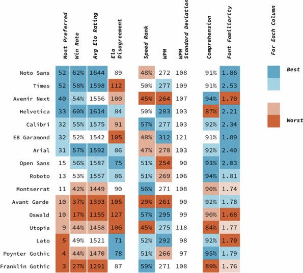 Noto Sans and Times were each chosen by 15% of all participants as the overall winners in the preference tests, with Avenir Next, Helvetica, Calibri, EB Garamond, and Arial also performing favorably according to the preference metrics.