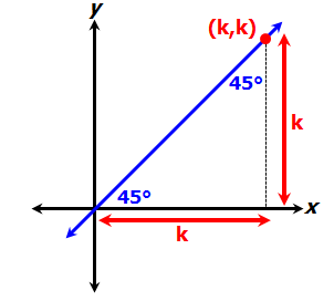 If we drop a line from a point ON the line, we see we get an ISOSCELES RIGHT triangle.