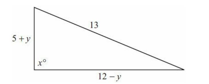 The figure looks like a right triangle with legs of length 5 + y and 12 – y and hypotenuse of length 13. If y = 0, then the sides of the triangle have lengths 5, 12, and 13. This triangle is in fact a right triangle because \(5^2 + 12^2 = 13^2\). So the angle labeled x° is a right angle; that is, x = 90. In this case, Quantity A is equal to Quantity B.