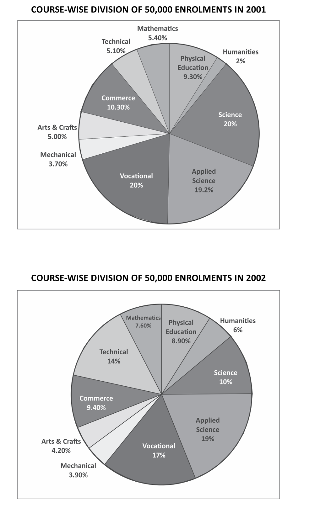 Let's calculate the percentage change in enrolments for each course from 2001 to 2002 using the pie charts.